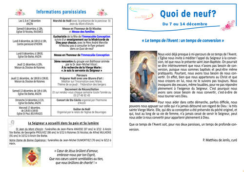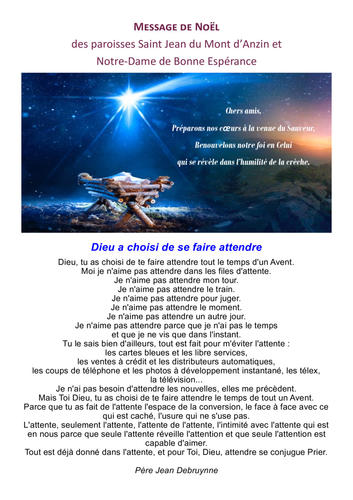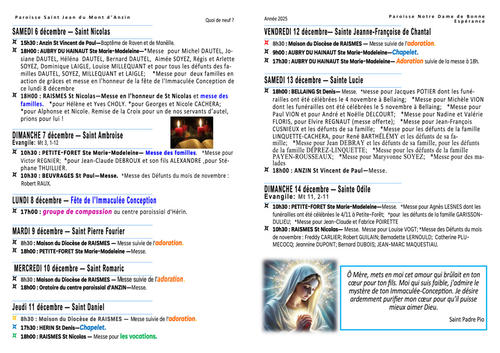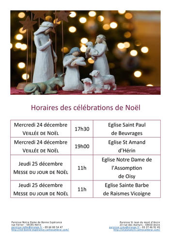 ainsi que le message de Noël avec les horaires et lieux des messes des 24 et 25 Décembre 2025